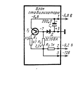 СТАБИЛИЗАТОР питание Т1-Т4 блока УНЧ н13, блока УКВ н4 (через переключатель-УКВ), блока КСДВ-ПЧ н7 3н=12в 2н=9,2в 1н=6,8в факт 6,99в